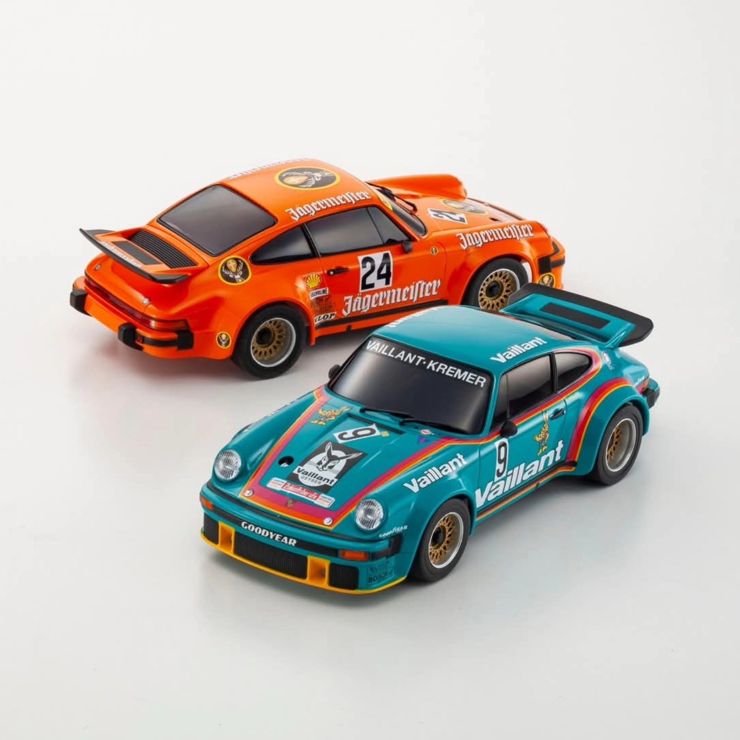 Zwei Ikonen des GT-Rennsports der 1970er Jahre kehren in MINI-Z-Form zurück: der Porsche 934 RSR Jägermeister #24 und der Porsche 934 RSR Vaillant #9, beide Legenden der Deutschen Rennsport Meisterschaft (DRM) von 1976.