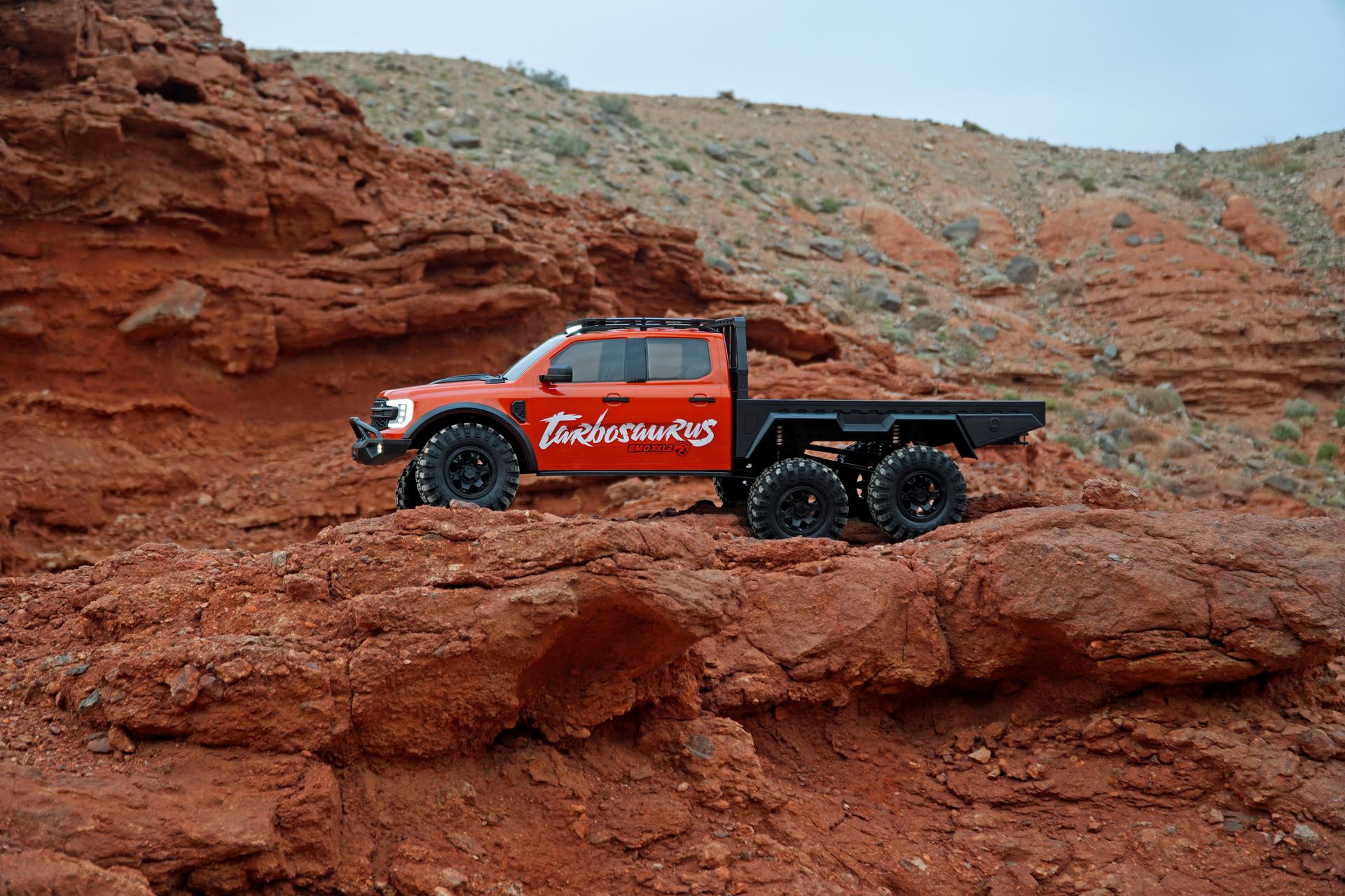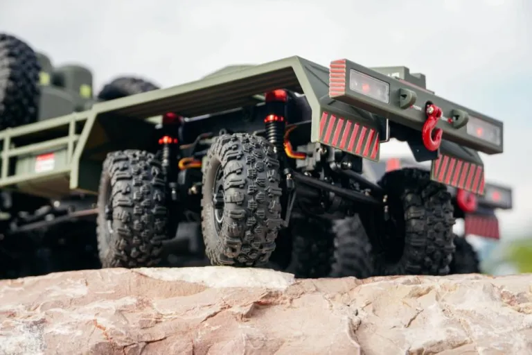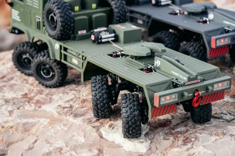 Die Pritsche besteht ebenfalls aus ABS, der Motor ist vorne montiert und mit einem 2-Gang-Mittelgetriebe ausgestattet. Es verfügt über eine Einzelradaufhängung und eine Drehstabfederung. Das Modell enthält bereits eine vollständige Beleuchtung sowie einen Brushed-Motor. Die Batteriebox für den Akku bietet Platz für eine maximale Größe von 152 mm x 53 mm x 33 mm, während der maximale Motordurchmesser 47 mm bei einer Länge von 80 mm beträgt.