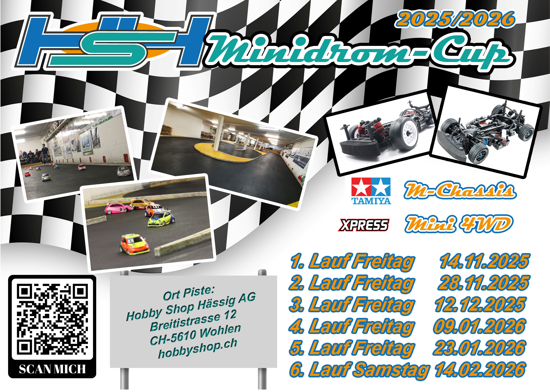 Im November startet wieder unser HSH Minidrom Cup welcher nun seit 30 Jahren ohne Unterbruch stattfindet! Gefahren wird wieder in den Kategorien Tamiya M-Chassis und XPress Mini 4WD! Alle Infos und Reglemente findest Du im Link untenstehend. Wir freuen uns auf viele Teilnehmer! Wie in den letzten Jahren muss man sich nur einmalig für die Teilnahme an der Rennserie anmelden, das Anmeldeformular ist ebenfalls aufgeschaltet.